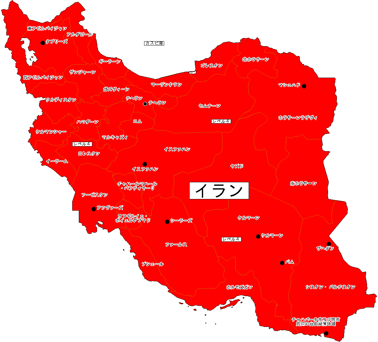 上記1の状況を受け、首都テヘランを含む、これまで危険情報がレベル3であった地域の危険レベルを4(退避勧告)に引き上げます。これにより、イラン全土の危険情報がレベル4(退避勧告)となります。