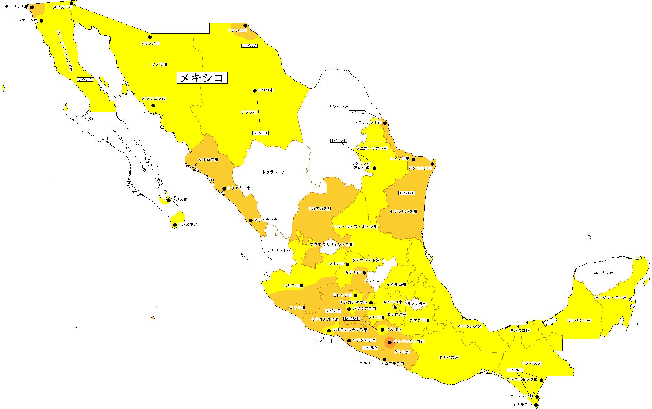 ●イダルゴ州、オアハカ州、カンペチェ州、キンタナ・ロー州、グアナファト州(危険レベル2が発出されている南部地域を除く)、ゲレロ州タスコ市、サン・ルイス・ポトシ州、ソノラ州、タバスコ州、チアパス州、チワワ州(フアレス市を除く)、ヌエボ・レオン州、バハ・カリフォルニア州(ティファナ市を除く)、バハ・カリフォルニア・スル州ラ・パス市及びロス・カボス、ハリスコ州(危険レベル2が発出されている南部地域を除く)、プエブラ州、ベラクルス州、ミチョアカン州の一部地域、メキシコ市、メキシコ州、モレロス州